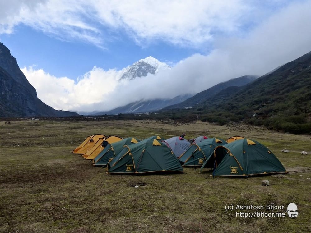 The camp site at Thansing (12900 feet) is cradled between two mountains on either side, with mount Pandim visible straight ahead. The valley created a conduit through which cold winds blew hard, making the cold bite through our warm clothing
