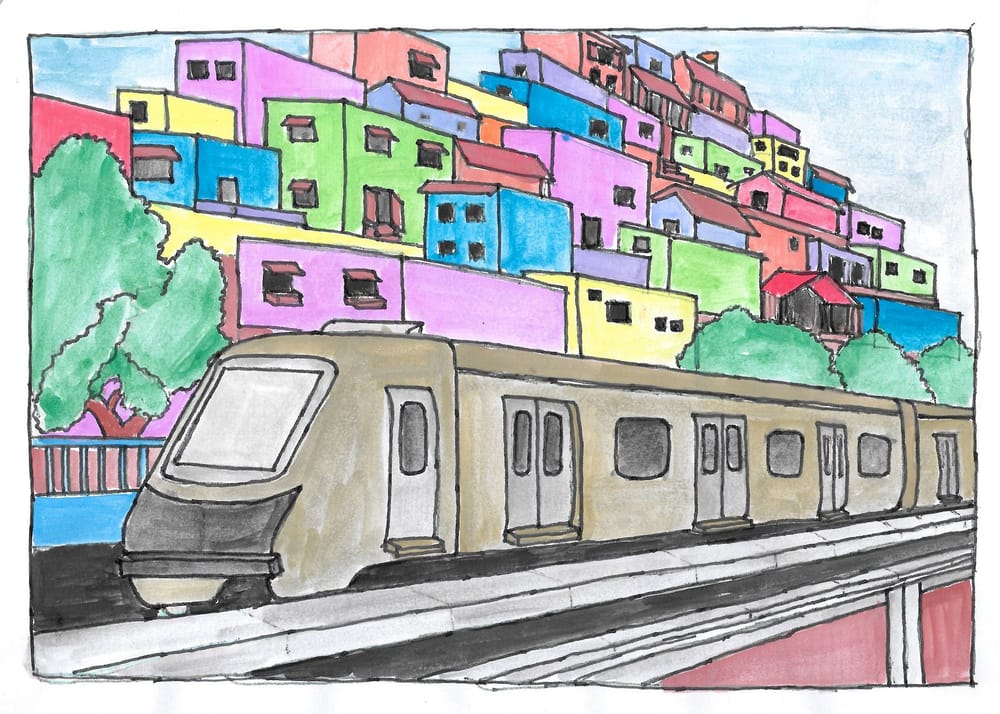 create an illustration with fountain pen ink outlines and water color fills, showing a metro train in the foreground and a crowded slum colony in the background with multi colored walls