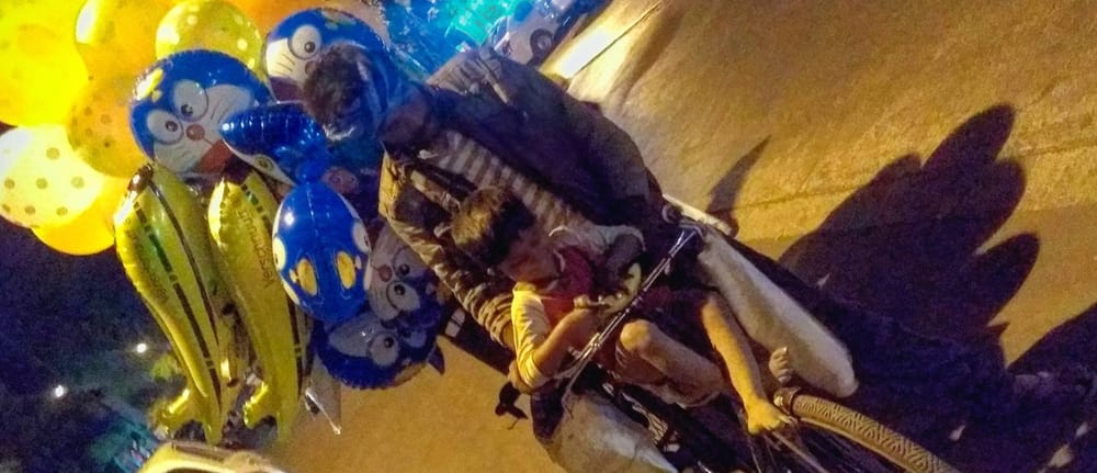 A few years back, I had come across a group of cycling gypsies from Rajasthan who cycled several miles across the country from place to place, eeking out a living by making handicrafts. I came across another one today. A father-son duo on a bicycle selling multi-colored balloons.